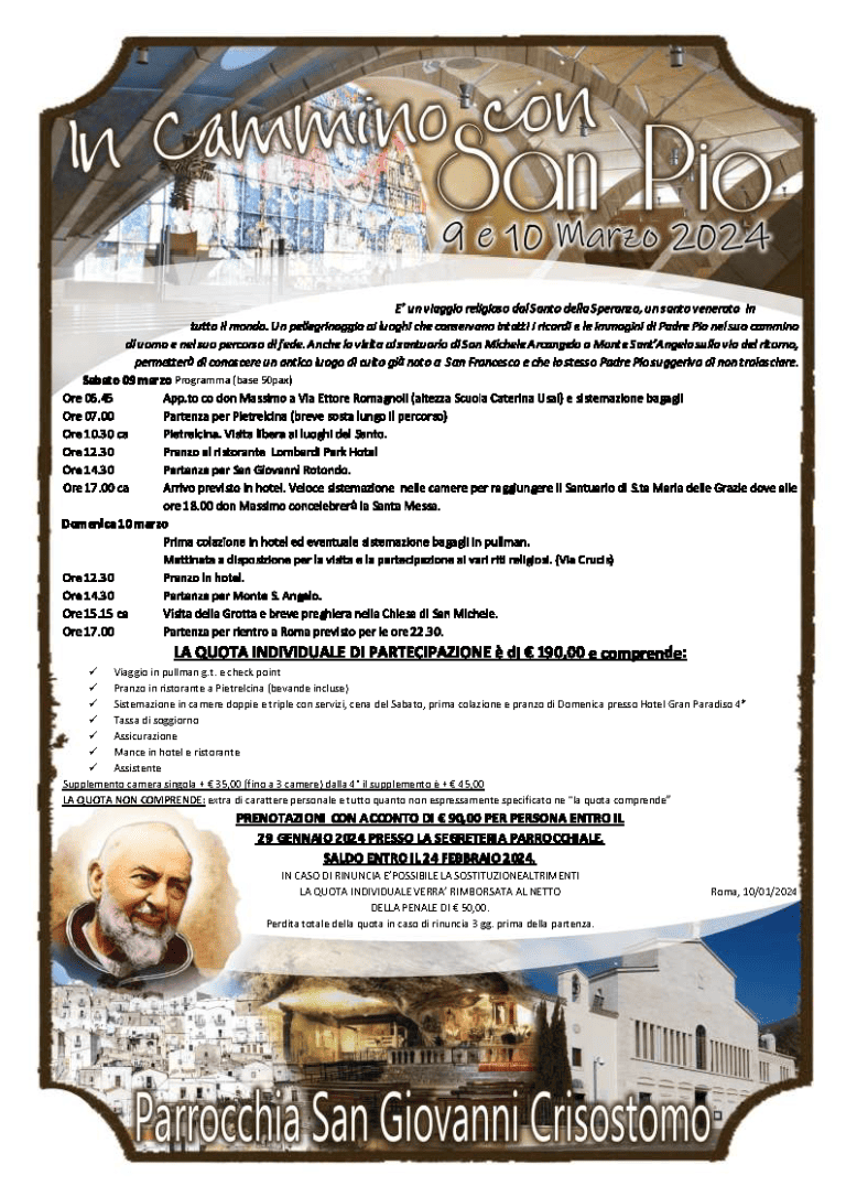 La Parrocchia organizza un pellegrinaggio spirituale dedicato a Padre Pio, il Santo della Speranza, e al Santuario di San Michele Arcangelo a Monte Sant’Angelo. Il viaggio si svolgerà il 9 e 10 marzo, con partenza da Roma alle ore 7:00.…